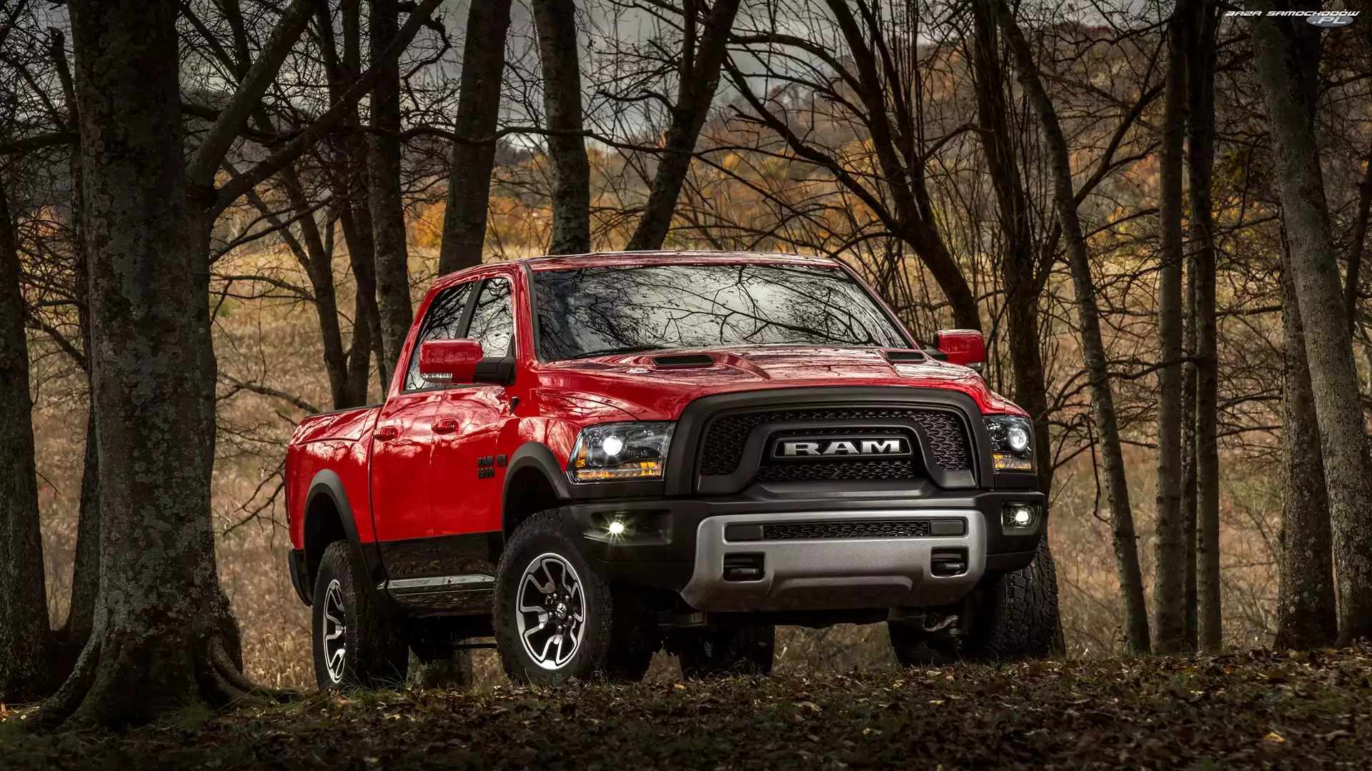 Samochód: Czerwony, Dodge Dodge RAM, Drzewa, Bezlistne